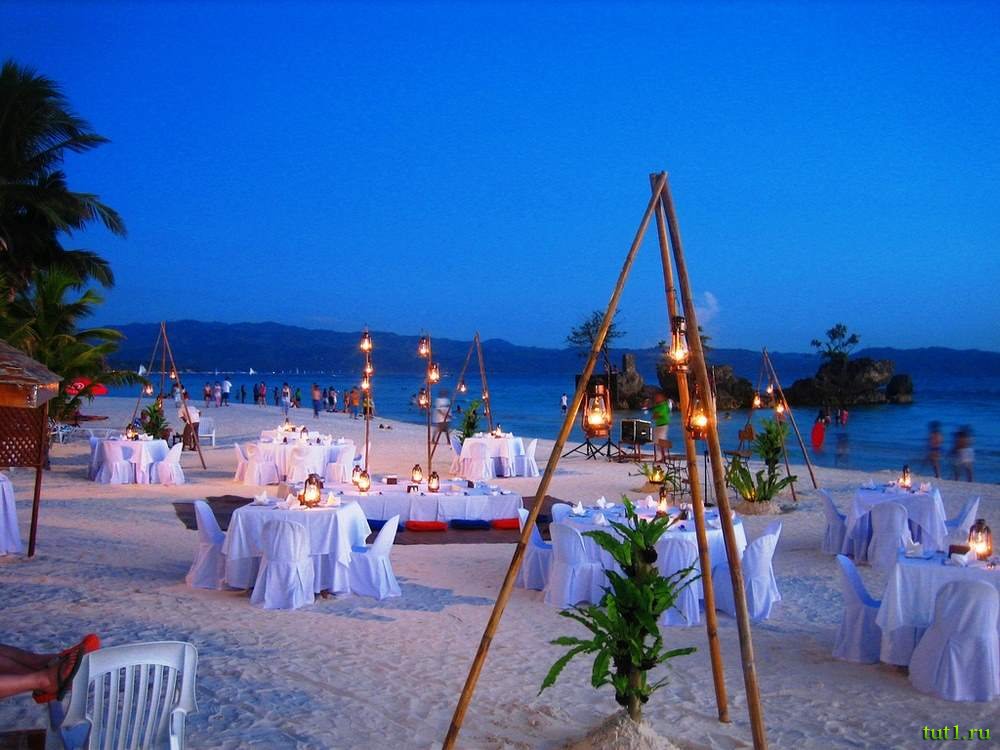 На закате широкие белоснежные пляжи превращаются в оживленные променады (набережные). В это время народу на них гораздо больше чем днем, когда они полупусты. И чем ниже опускается солнце за горизонт — тем быстрее ускоряется темп жизни острова. Оживают бесчисленные пляжные рестораны, из баров, что расположены буквально на каждом шагу, звучит музыка, магазинчики бойко торгуют всякой местной всячиной, открываются дискотеки, караоке и прочие ночные заведения — так что боракайские ночи обещают быть жаркими.