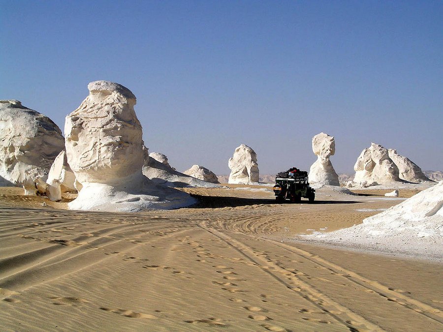 На пути к Белой пустыне можно полюбоваться другими потрясающими видами: барханами, дикими песками, рельефом Черной пустыни и посетить оазисы, которые раскинулись на пути к Белым пескам. Черная пустыня предшествует цели маршрута. Почва тут темно-коричневого цвета с примесью черной вулканической породы. Между Бахарией и Фарафрой и находится основная точка путешествия. Белая пустыня представляет собой 300 квадратных километров странного рельефа Сахары: ослепительный песок, меловые валуны и каменные фигуры. Некоторые из этих природных сооружений формой напоминают гигантский гриб, женский портрет, рыбака, коралл, волну и многое другое, что подскажет воображение.